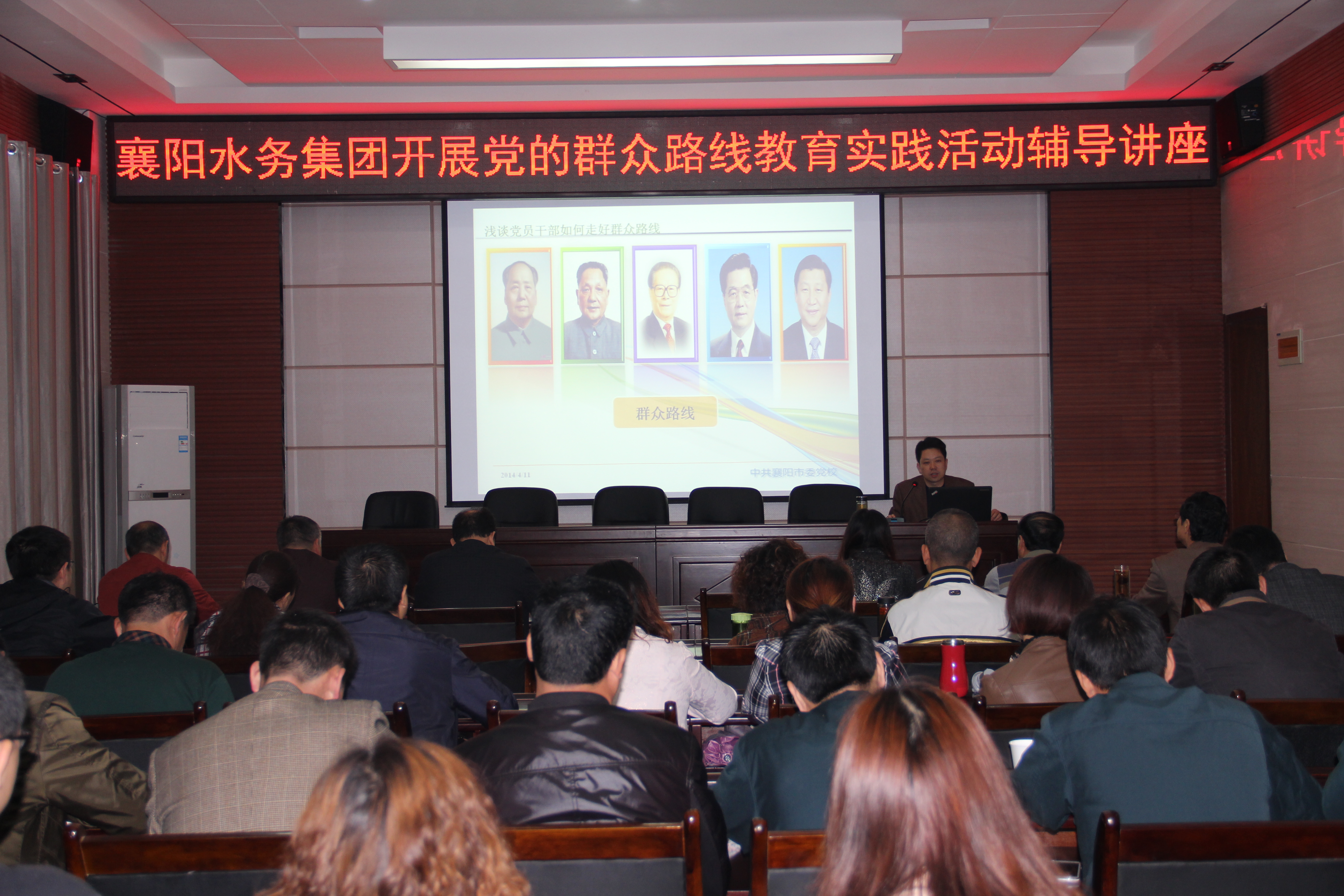 4月11日上午,襄陽水務(wù)集團有限公司邀請市委黨校常務(wù)副校長黃進教授為公司黨員干部做群眾路線教育專題輔導(dǎo)。黃校長精心準備了題為《淺談黨員干部如何走好群眾路線》的講座。他從堅持黨的群眾路線的重要內(nèi)涵、當(dāng)前堅持群眾路線的異常急迫性和如何踐行群眾路線三個方面對開展黨的群眾路線教育實踐活動的重要性進行了詳細的闡述。黃校長的講座內(nèi)容精彩豐富,圖文并茂,通過一個個典型生動的例子,讓每一個在場的干部職工都了解到了黨的群眾路線教育實踐活動“是什么”“為什么”和“怎么做”。通過此次講座,公司黨員干部對群眾路線教育實踐活動有了更加深刻的認識和理解,增強了為群眾服務(wù)的自覺性。
